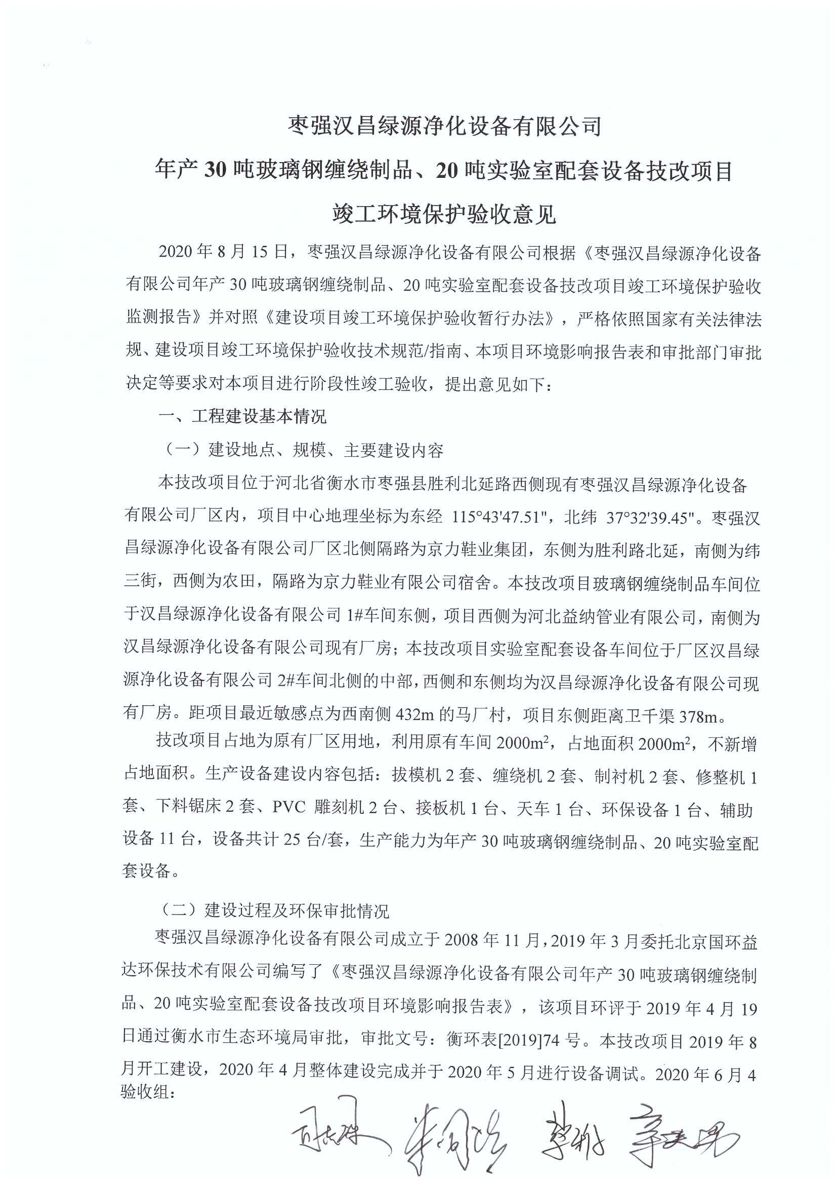 棗強漢昌綠源凈化設備有限公司年產30噸玻璃鋼纏繞制品、20噸實驗室配套設備技改項目竣工環境保護驗收意見